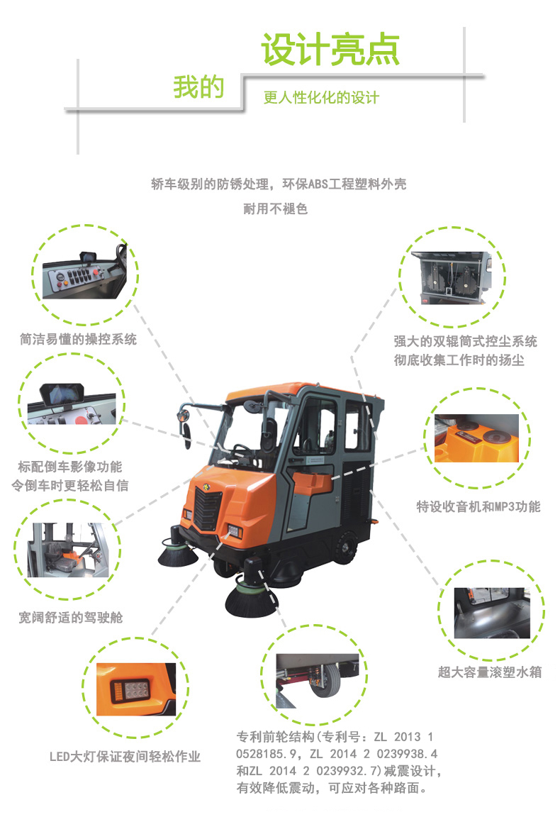 2、独家采用专利设计的减震系统,有效保护电子元器件的同时提高操作舒适性;采用230升超大垃圾箱,提高清扫效率。