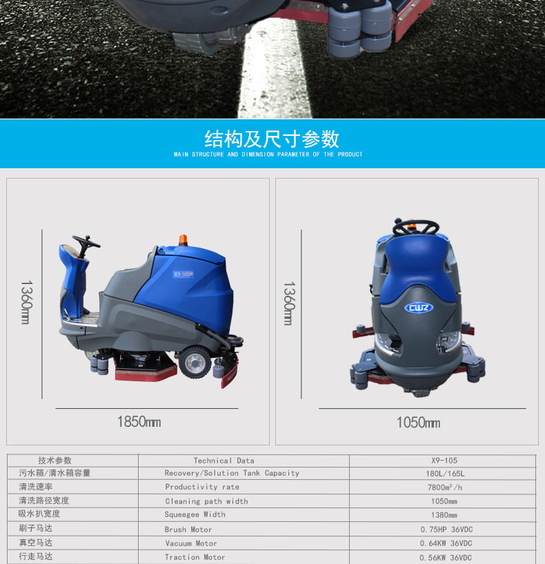 洗擦、吸干一次性完成,洗刷吸干过的地面,清洗多种地面,如脏水、泥土、沙粒、油污统统吸入污水箱。简化清洁工作,大大减少清洁劳累和作业时间;快速解决地板上的任何污垢,显著提高清洁卫生质量。适合10000㎡以上场所使用。