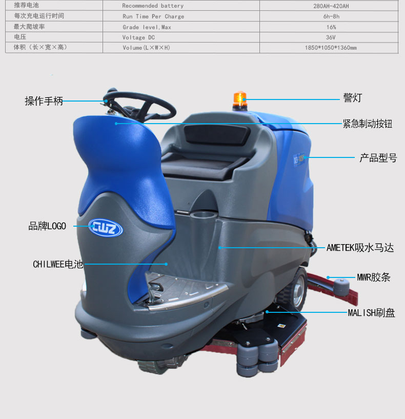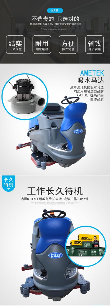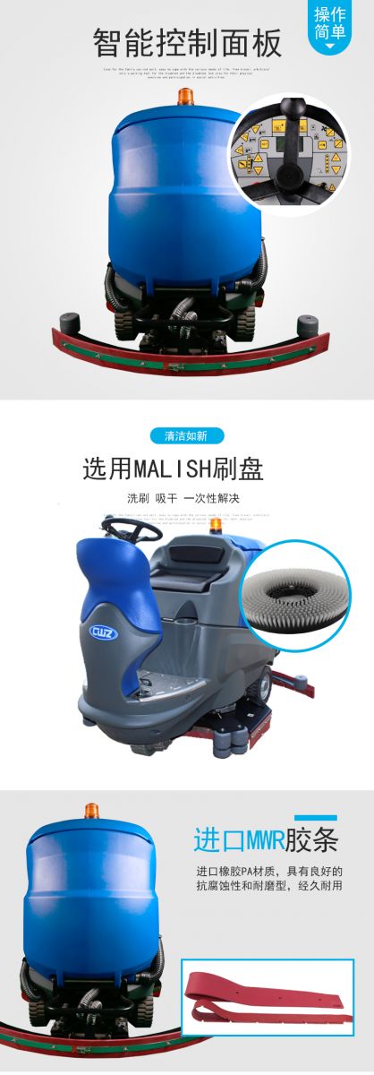 产品特点: 1、意大利AMER原装前驱马达,动力大且耐用。 2、全新只能控制面板,一键实现全部功能,操作简便。 3、配备加液系统,有效清洗局部地区的顽固污渍。 4、大开口的污水箱可倾倒,方便清理污水箱。 5、大容量水箱及大容量电瓶能提高清洁效率,降低清洁管理成本。 6、进口吸水胶条可反复使用四次,无 ...